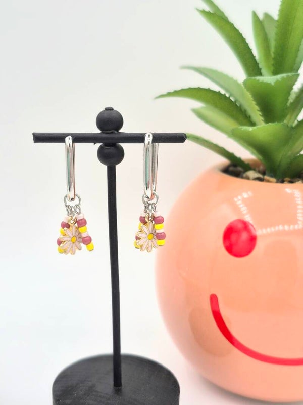 Speelse en zomerse oorringetjes met bedels van kraaltjes en een madeliefje.