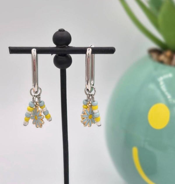 Speelse en zomerse oorringetjes met bedels van kraaltjes en een madeliefje.