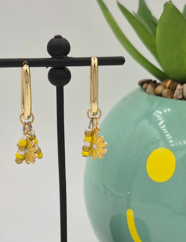 Speelse en zomerse oorringetjes met bedels van kraaltjes en een madeliefje.