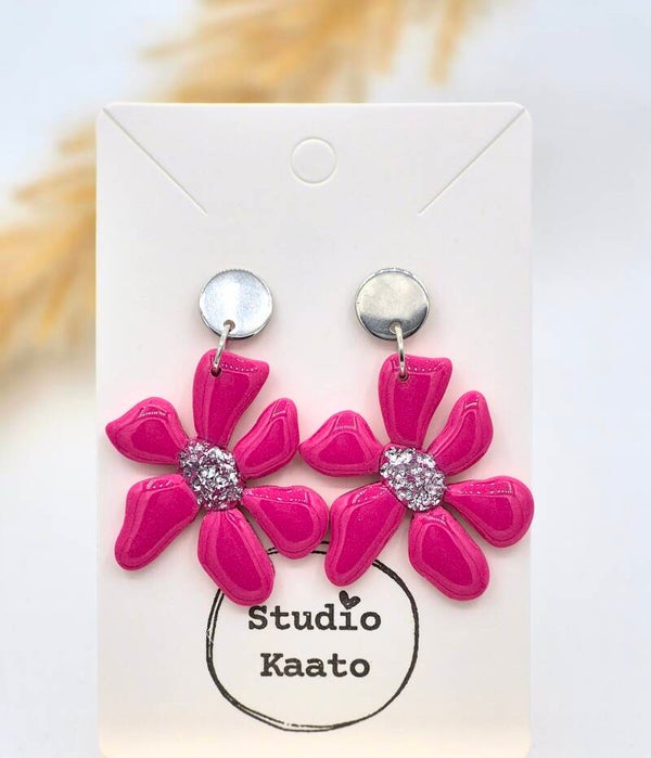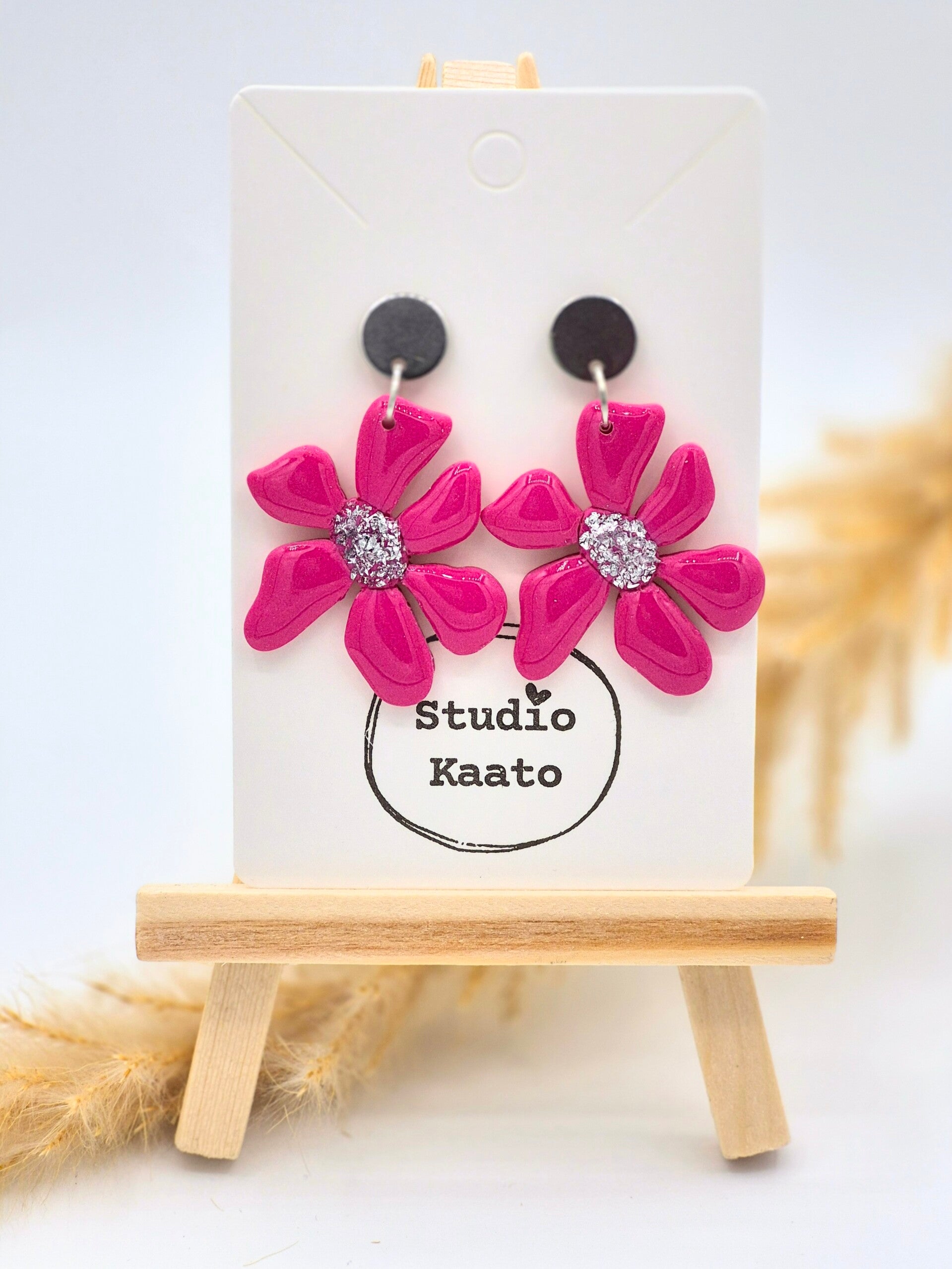 Kleur: Fuchsia met bladzilver aan een zilverkleurige oorbel.