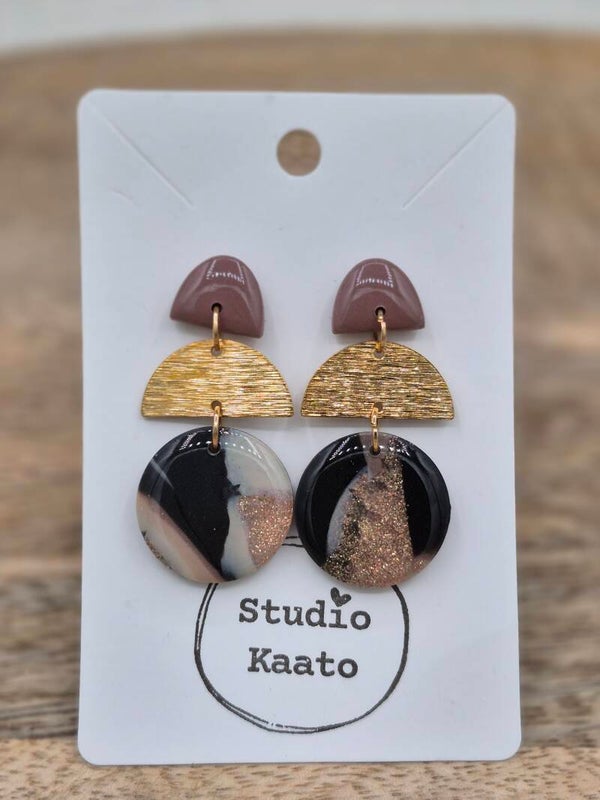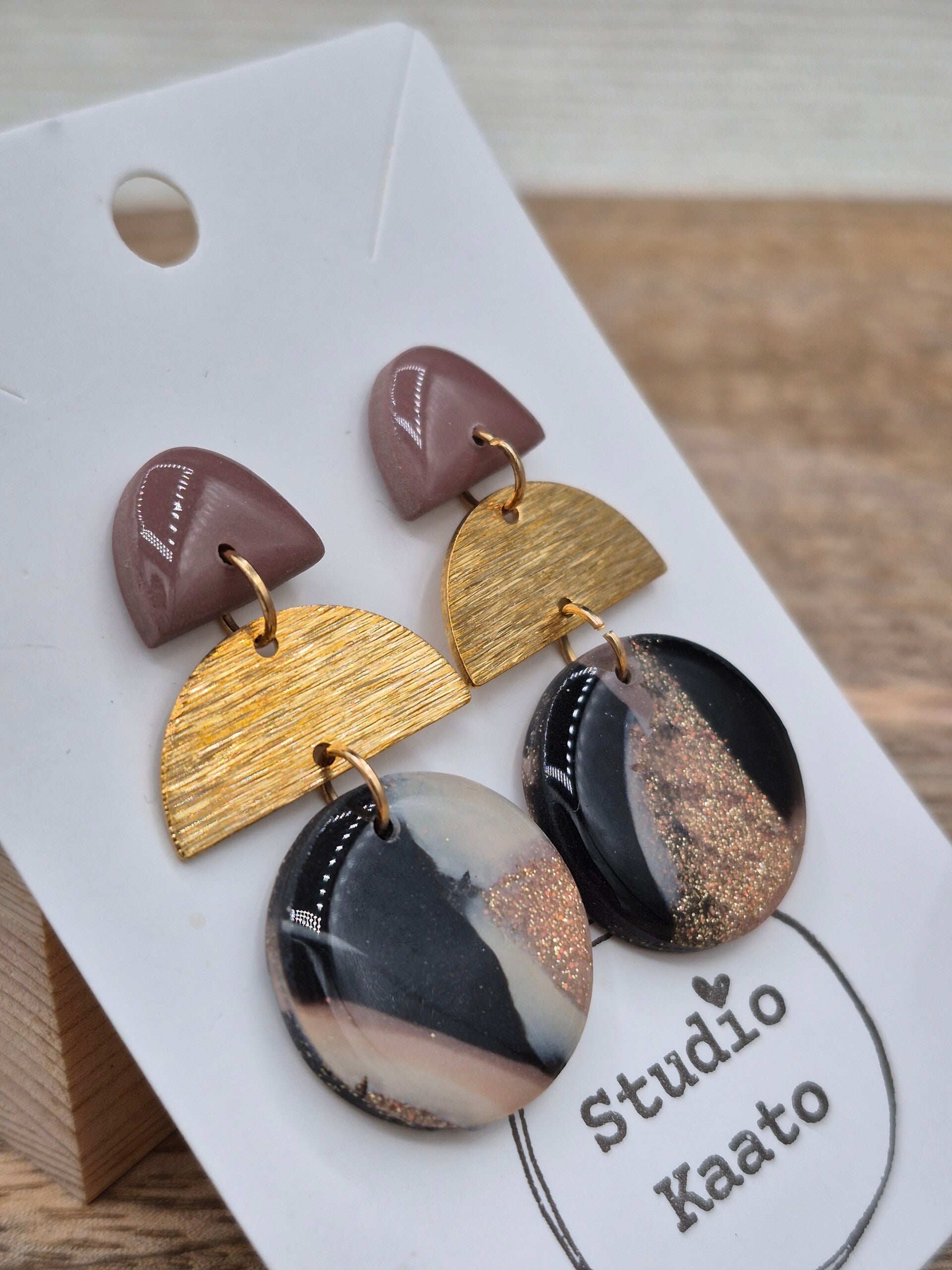 Kleur: oud roze met glitter, beige, zwart en een goudkleurige rvs halve cirkel. Voorzien van een glanslaagje resin.