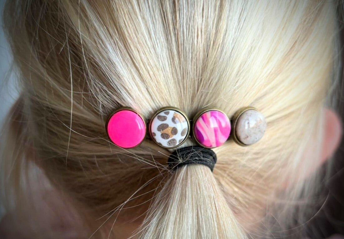 Haarspeld met 4 verschillende rondjes polymeerklei met een laagje resin.
