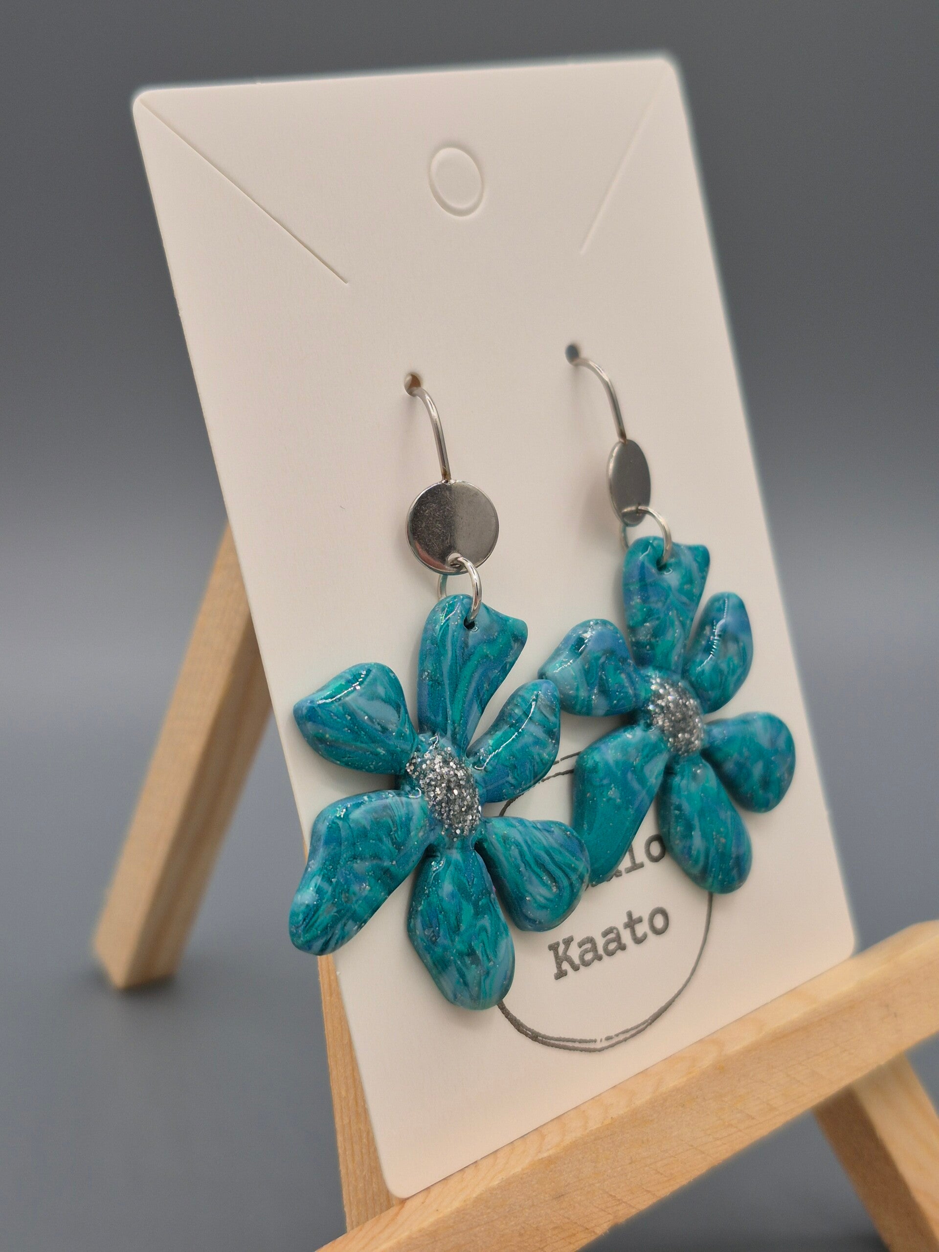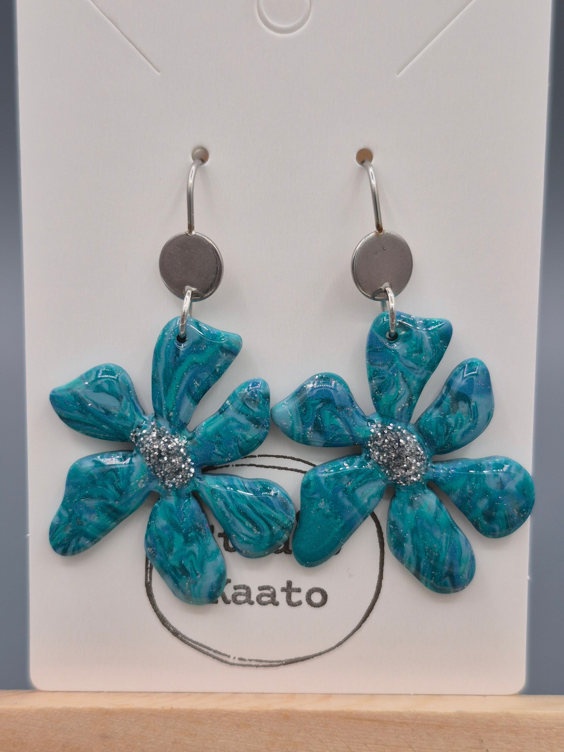 Kleur: blauwtinten met bladzilver aan een zilverkleurige oorbel.