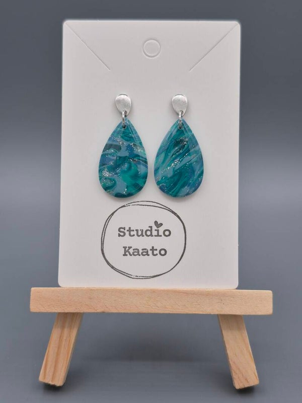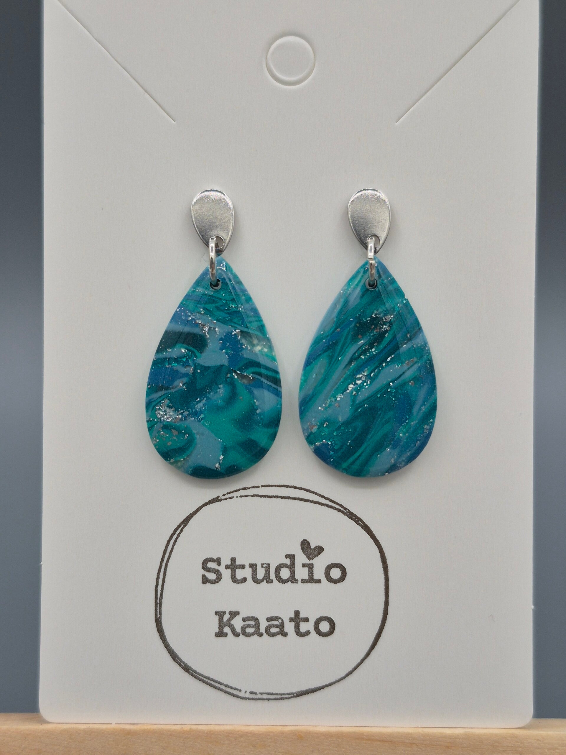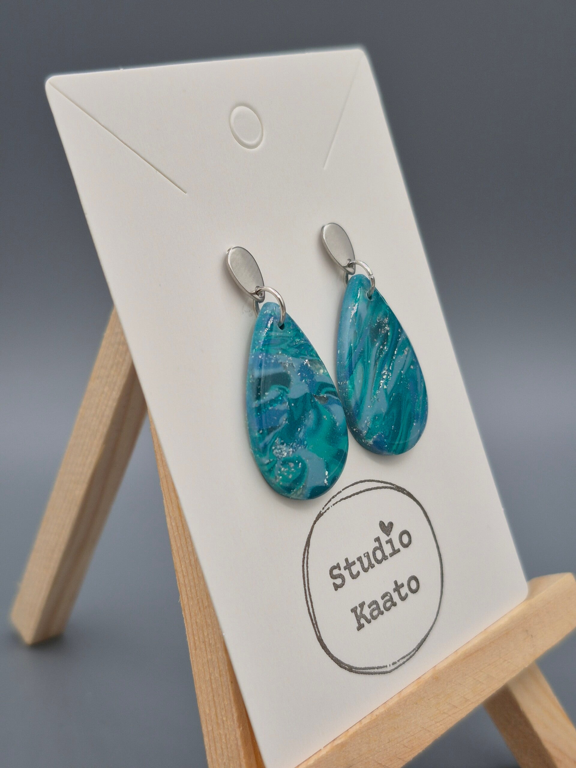 Kleur: blauwtinten met bladzilver aan een zilverkleurig knopje in drup vorm.